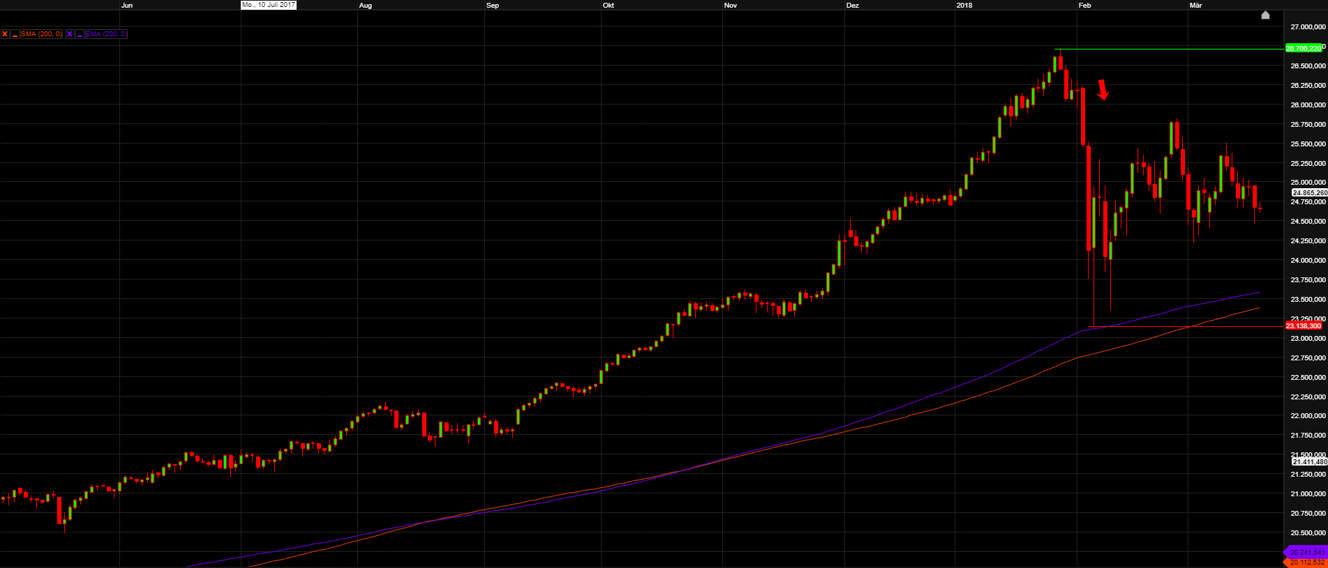 Im Dow Jones ging es Ende Februar/Anfang März von ca. 26.700 Punkten bis auf ca. 23.140 Punkte abwärts. Dies ergibt prozentual einen Wert von etwa -13,33%. Natürlich kann man es nun trotzdem nicht als Crash oder sonstiges bezeichnen. Es war immer noch eine begründete Korrektur! Also nicht jeder Wert größer 10,1% ist gleich ein Crash.