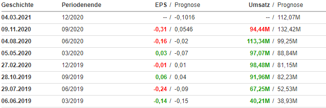 Im nächsten Schritt schauen wir uns die aktuellen Quartalsergebnisse von 2020 an. Wie zu erkennen ist der Umsatz bis auf das 3.Quartal immer besser ausgefallen als erwartet. Der Gewinne je Aktie (EPS) ist jedoch meistens schlechter ausgefallen als erwartet und lag zum Teil auch im negativen Bereich.