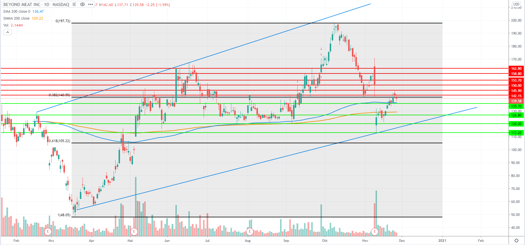 Am 09.11.2020 wurden zuletzt Quartalsergebnisse von Beyond Meat veröffentlicht. EPS und Umsatz fiel beides schlechter aus als erwartet. Zusätzlich gab McDonald’s bekannt, dass sie ihren eigenen fleischlosen Burger (“McPlant”) 2021 in ihr Angebot aufnehmen werden. Zunächst wurde Beyond Meat nicht als einer der Produzenten für den Burger genannt.