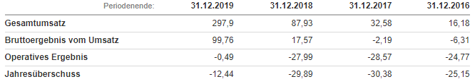 Der Umsatz ist seit 2016 stetig gestiegen und hat sich jedes Jahr mehr als verdoppelt. In den letzten Jahren gab es immer einen Jahresfehlbetrag bzw. Reinverlust. Allerdings ist auch hier eine positive Tendenz für die Zukunft zu erkennen. Die folgenden Kennzahlen basieren alle auf der Bilanz von 2019.