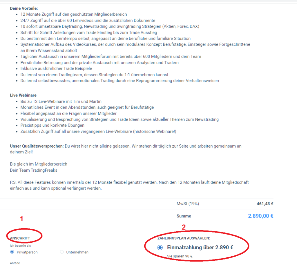 Dort füllst du deine Anschrift aus und wählst die Einmalzahlung für 2.890 EUR (die Paypal Ratenzahlung kommt im nächsten Schritt).