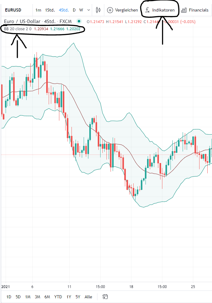 Um die Bollinger Bänder als Indikator nutzen zu können, muss man diese zunächst zu seinem Chart hinzufügen. Sie sind in fast jeder Handelssoftware standardmäßig enthalten.