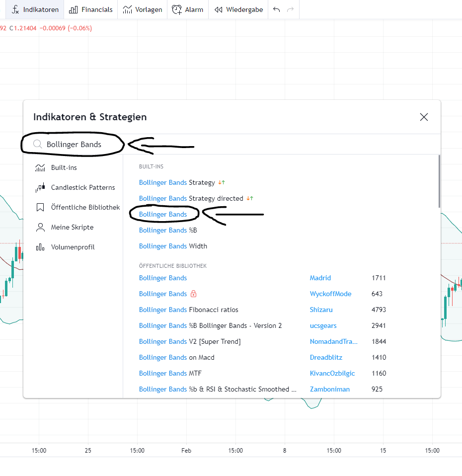 Zunächst wählt man bei Trading View den entsprechenden Basiswert aus. Danach wählt man in der oberen Leiste den Reiter “fx Indikatoren” aus. Nun gibt man in der Suchleiste “Bollinger Bands” ein und klickt diese an. Jetzt sollten die Bollinger Bänder automatisch im Chart hinzugefügt sein. Die Standardeinstellungen können so beibehalten werden.