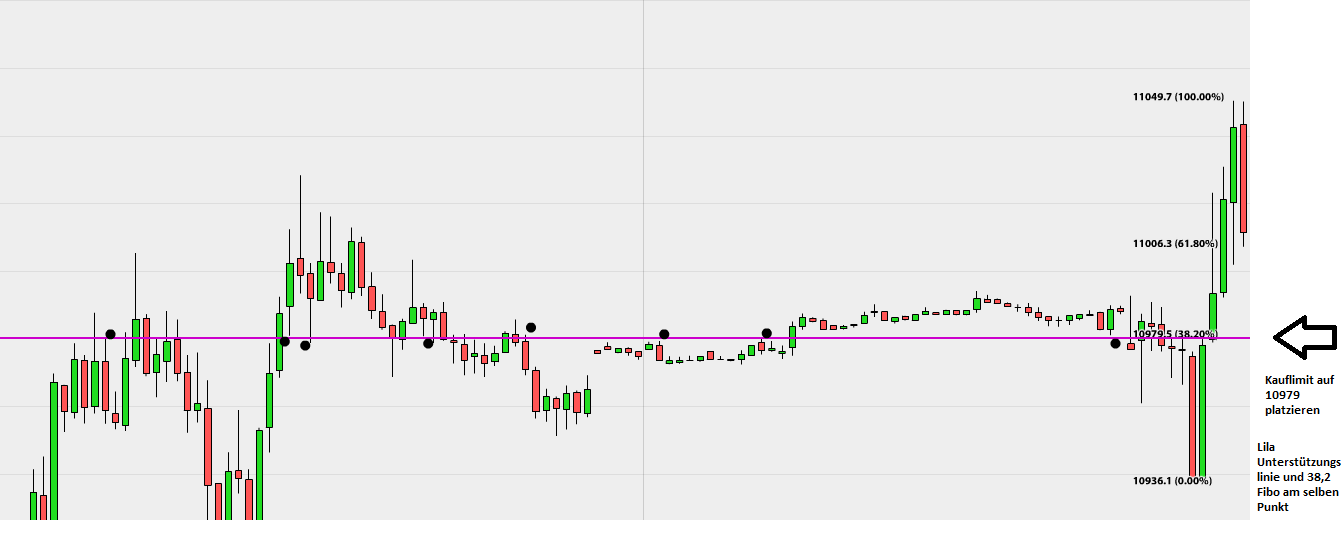 Im unteren Chart ist dies am 38er Fibo der Fall. Die schwarzen Punkte markieren lediglich die Deutlichkeit der Unterstützungslinie (lila).