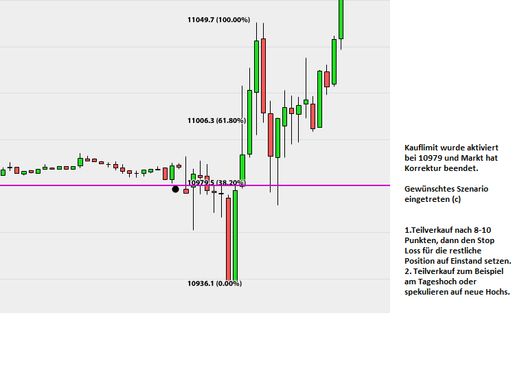 b) Der Rebound erfolgt an meiner – oder in der Nähe meiner Tradeeröffnung und mein Trade läuft ein paar Punkte ins Plus. Danach dreht er aber wieder in die zuvor gestartete Korrektur (also gegen meine Trade-Richtung).