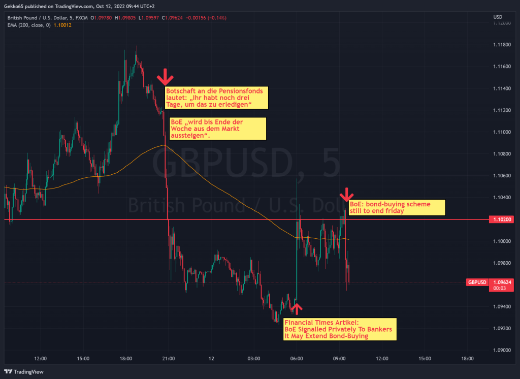 Am heutigen Morgen erschien dann um kurz nach sechs ein Artikel der Financial Times, welcher behauptete, dass die Bank of England signalisiert habe, dass diese das Anleiheprogramm doch verlängern werde. Ein wenig merkwürdig so kurz nachdem der Vorsitzende der Bank etwas anderes gesagt hatte.
