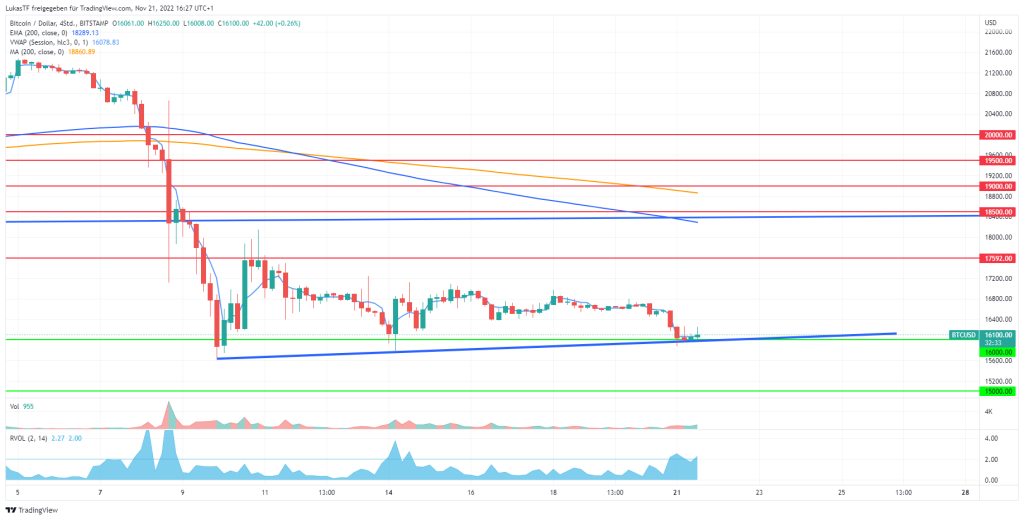 Die steigende Trendlinie in Kombination mit der runden Marke bei $16.000 dient aktuell noch als Unterstützung. Sollten diese Level nach unten hin gebrochen werden, könnte sich der Abschwung verstärken.