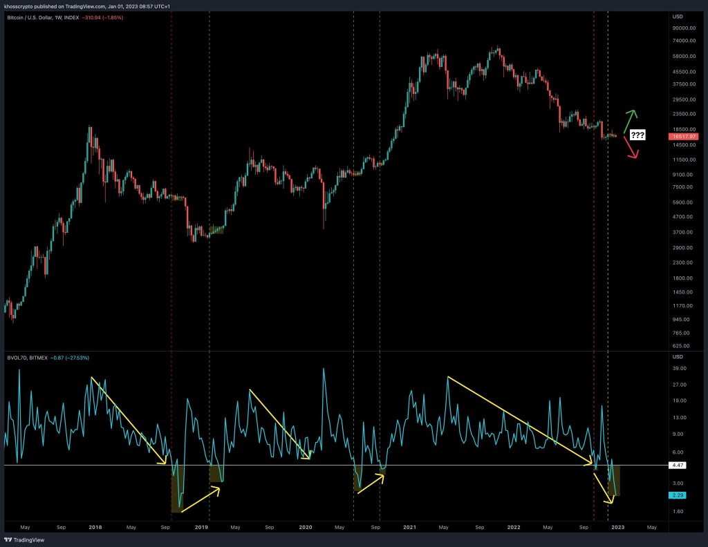 Die Bitcoin-Volatilität befindet sich nicht nur auf einem Rekordtief der letzten 4 Jahre, sondern auch in dem Bereich, nach dem uns historisch betrachtet, innerhalb wenigen Tagen / Wochen eine große Preisbewegung erwarten könnte. Dies könnt ihr in der unteren Grafik erkennen.