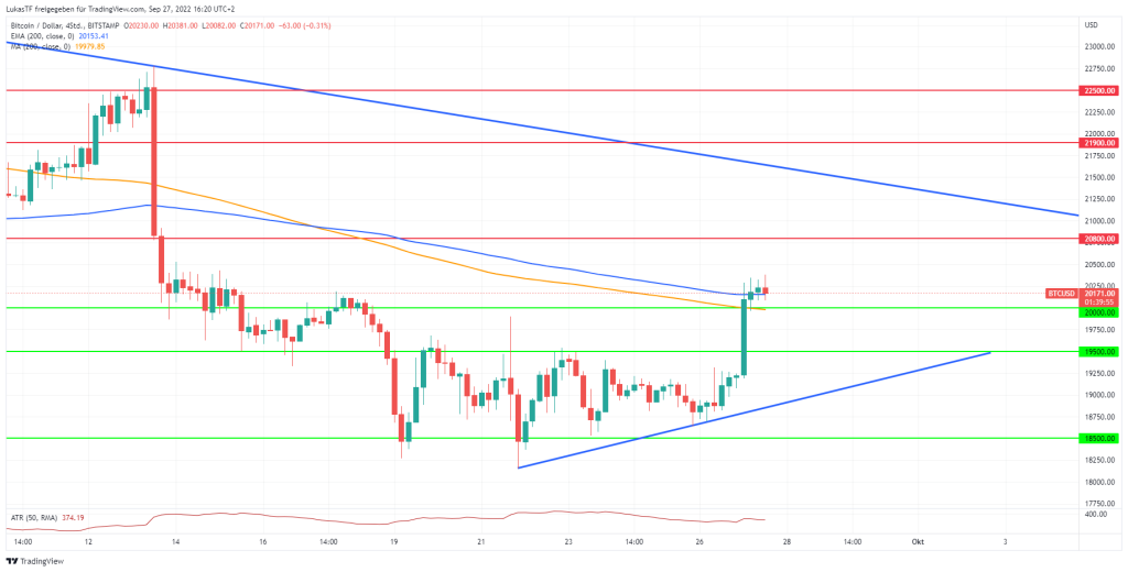 Die nächste markante Widerstandszone liegt bei $20.800. Danach könnte die fallende Trendlinie aus dem Tageschart angelaufen werden.