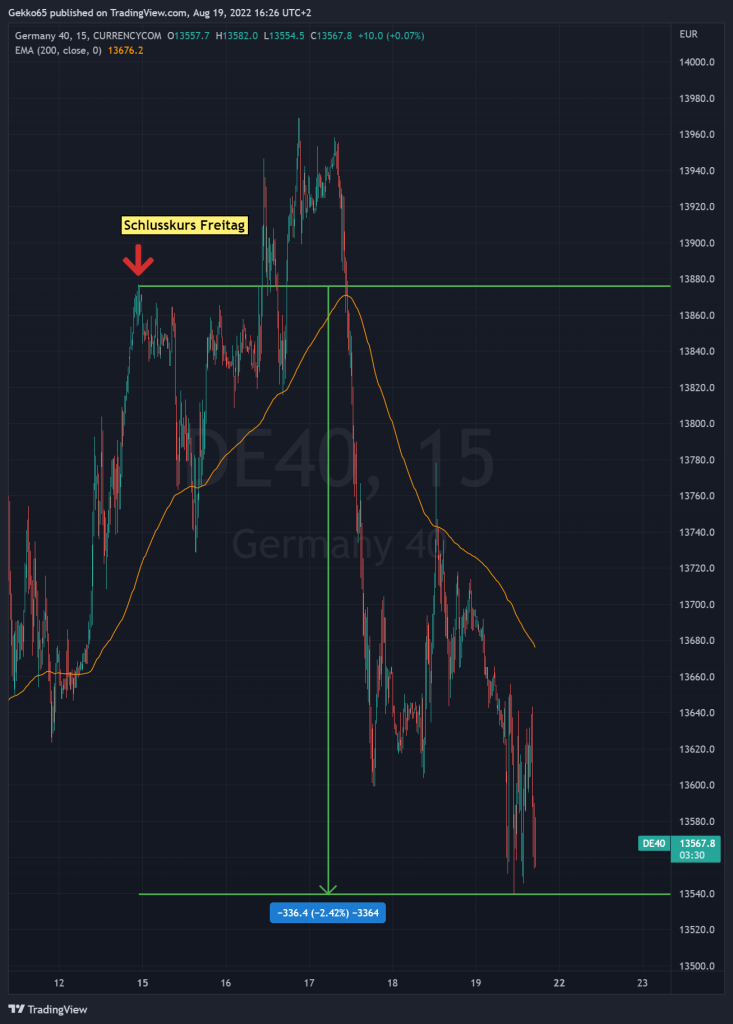 Erreicht der Index in der vergangenen Woche einen Wochenschlusskurs von 13.869 Punkten, so beendet er die aktuelle Woche rund 200 Punkte tiefer bei aktuell ca. 13.570 Punkten.
