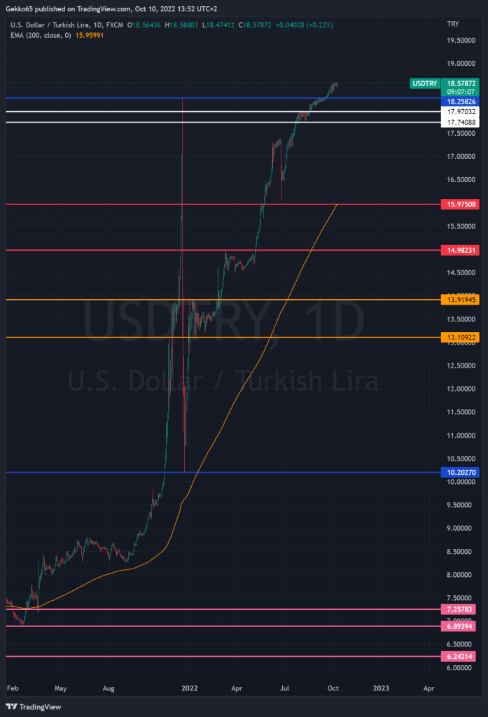 Erdogan ist weiterhin der Ansicht, dass man eine hohe Inflation (zuletzt 83,45% auf Jahressicht) mit niedrigen Zinsen bekämpfen muss.