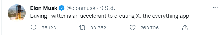 Er will mit der Übernahme “X – The Everything App” starten und verspricht sich durch den Kauf von Twitter nach eigenen Angaben einen zeitlichen Vorsprung von rund 3-5 Jahren im Vergleich zu einer kompletten eigenen Kreation.
