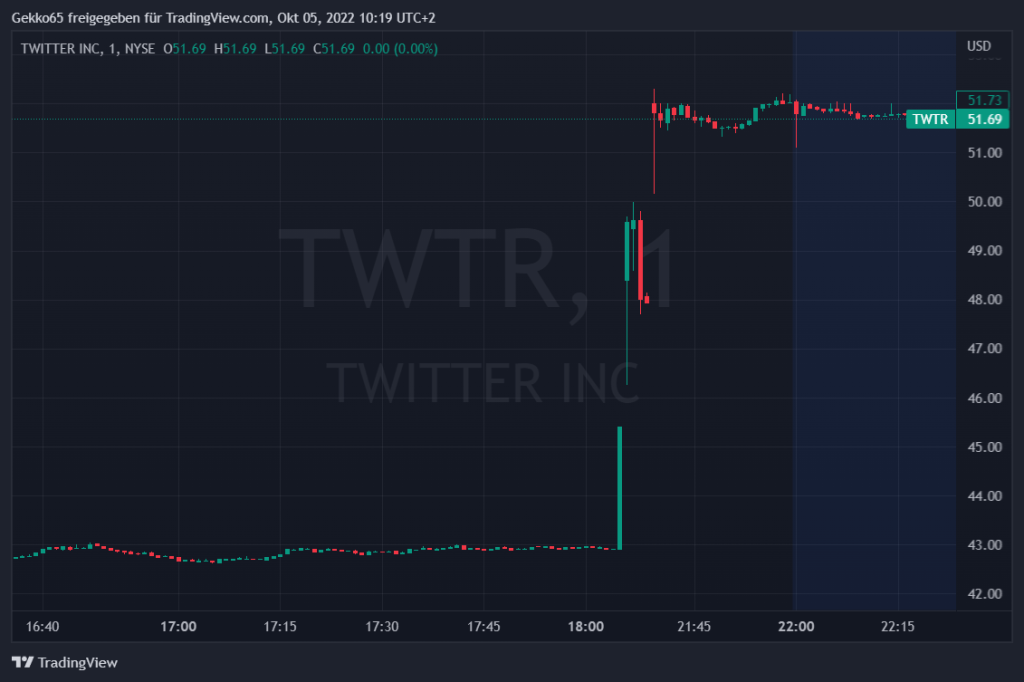 Am gestrigen Abend um kurz nach sechs kam es auf einmal zu einem starken Volumen- und Kursanstieg bei Twitter. Die Aktie wurde in der Folge mehrmals angehalten und beendete den Tag mit rund 22% im Gewinn.