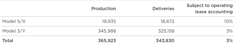 Tesla ($TSLA) hat mitgeteilt, dass man insgesamt 365.923 Fahrzeuge produziert hat. Damit konnte der Konzern die Schätzung von Bloomberg (359.853) zwar noch übertreffen, enttäuschte jedoch bei den tatsächlichen Zahlen zu den Auslieferungen.