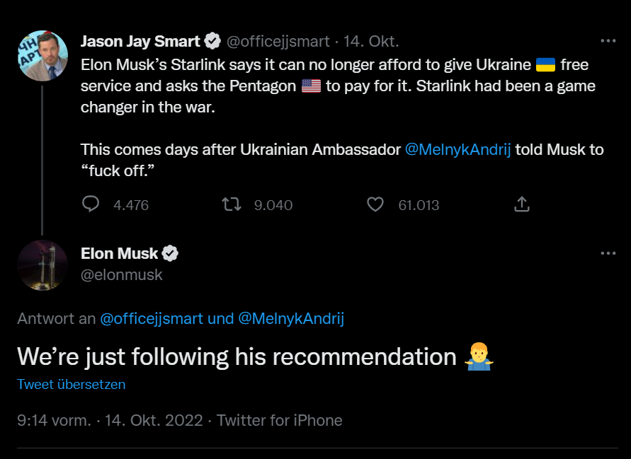 Dies betrifft auch Starlink. Das Unternehmen versorgt bisher die Ukraine mit Internet und Musk hatte nach einer Äußerung des Botschafters spontan damit gedroht dieses abzuschalten.