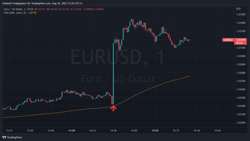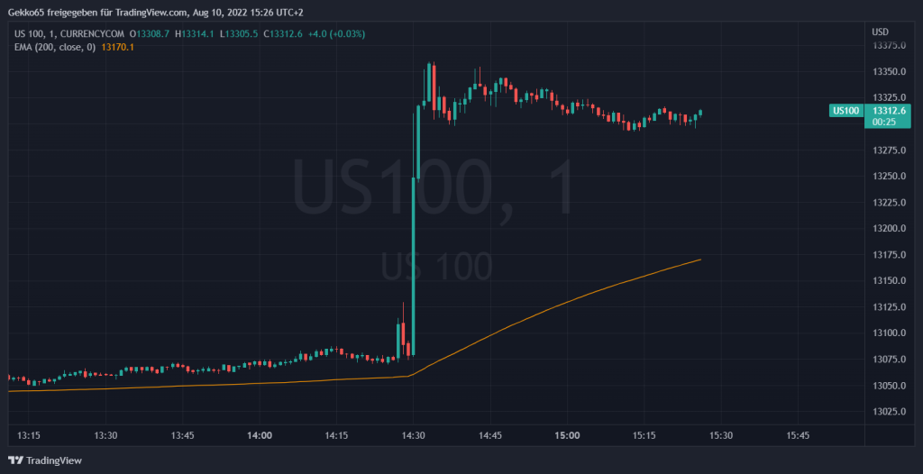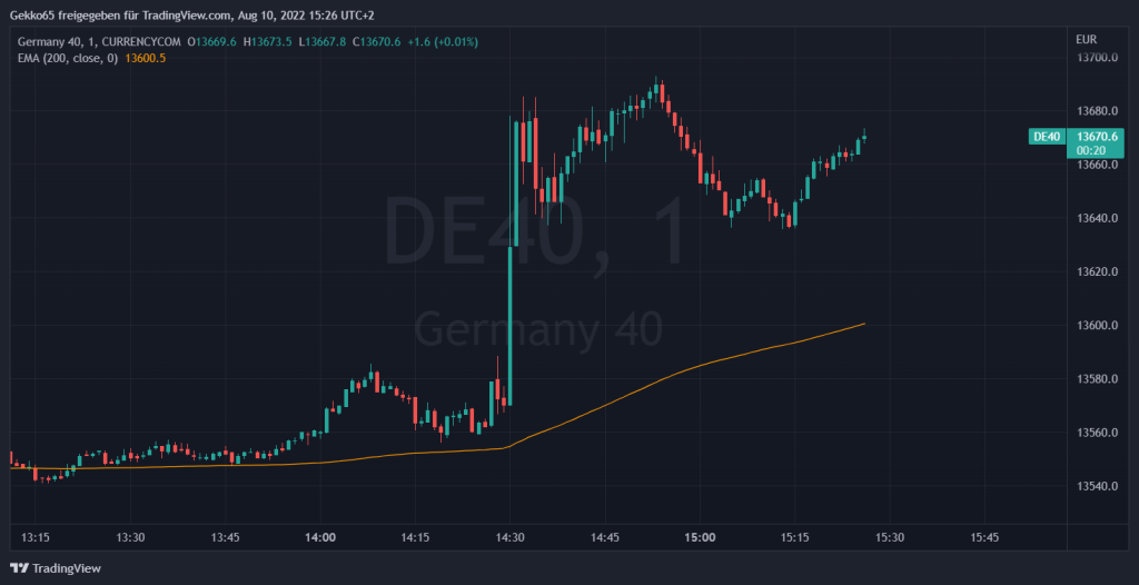 Vor den Daten hatte der Markt größtenteils noch eine stärkere 75 Basispunkte Erhöhung eingepreist. Nach den schwächeren Daten sind es nun “nur” noch 50 Basispunkte, welche für den kommenden Zinsentscheid im September eingepreist sind.