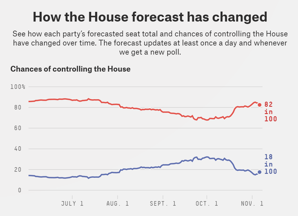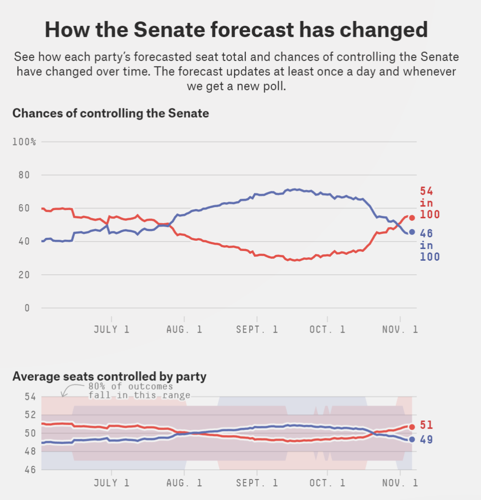 Die bekannte US-Nachrichtenwebsite FiveThirtyEight mit dem Fokus auf Daten, Statistik und Umfragen sieht aktuell eine Mehrheit für die Republikaner in beiden Kammern.