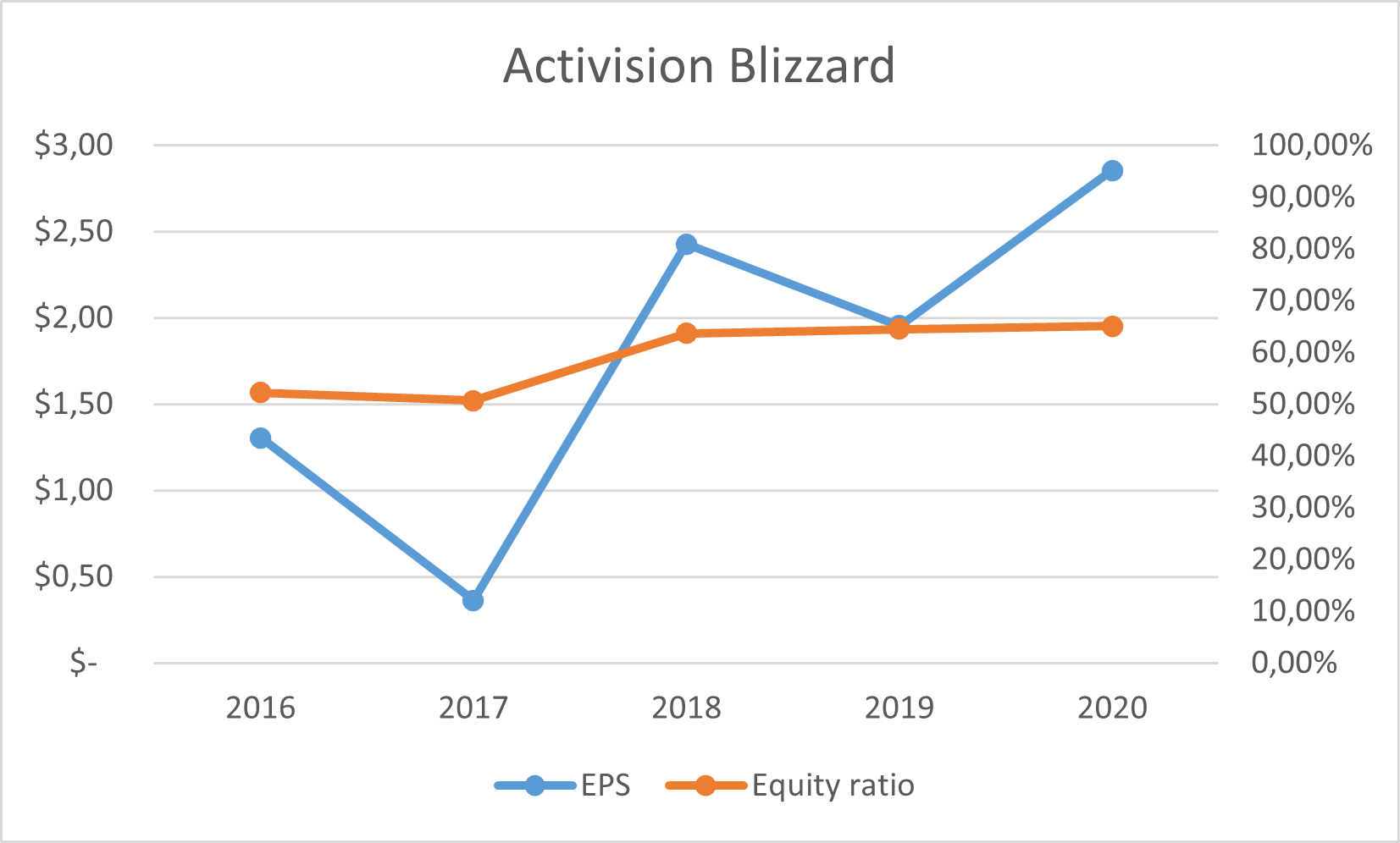 Im nächsten Schritt werden die fundamentalen Indikatoren von Activision Blizzard beleuchtet. Die Earnings Per Share haben in den letzten Jahren ein auf und ab erlebt, wobei sie bei einer übergeordneten Betrachtung dennoch einen Aufwärtstrend aufweisen. Dies spricht erstmal für eine steigende Profitabilität des Unternehmens, wobei die Schwankungen eine Prognose für die nächsten Jahre erschweren.