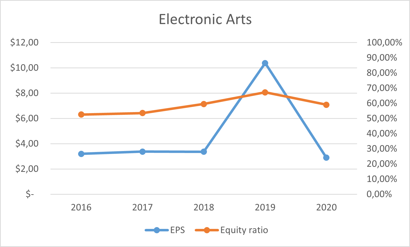 Der Anteil von EAs Eigenkapital stieg hingegen seit 2016, mit Ausnahme von 2020, kontinuierlich weiter an. Die Veränderung sieht über die Jahre auch nicht ungesund fürs Unternehmen aus, da keine drastische Änderung in der Unternehmensstruktur stattgefunden hat. Aktuell ist der Eigenkapitalanteil von rund 67% im Hinblick auf die Konkurrenz als branchenüblich einzuordnen.