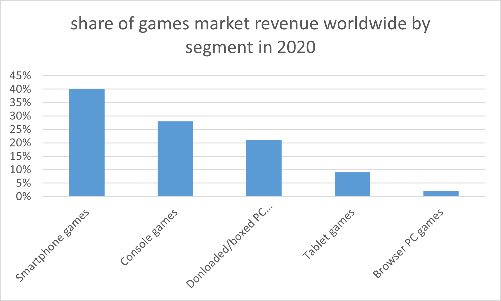 Neben klassischen Videospielherstellern gibt es alternativ auch jene für Handyspiele. Im Jahr 2020 waren die Anteile am globalen Spielemarktumsatz laut Newzoo wie folgt auf die möglichen Endgeräte verteilt: