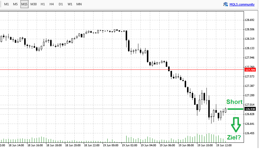 Der isolierte Blick in den M15 hilft mir bei der Zielfindung nicht weiter. Einen Stop Loss kann ich hieraus noch ableiten, da der Kurs sich zuvor in der oberen Hälfte des Bildes bewegte und mir Widerstände präsentiert.