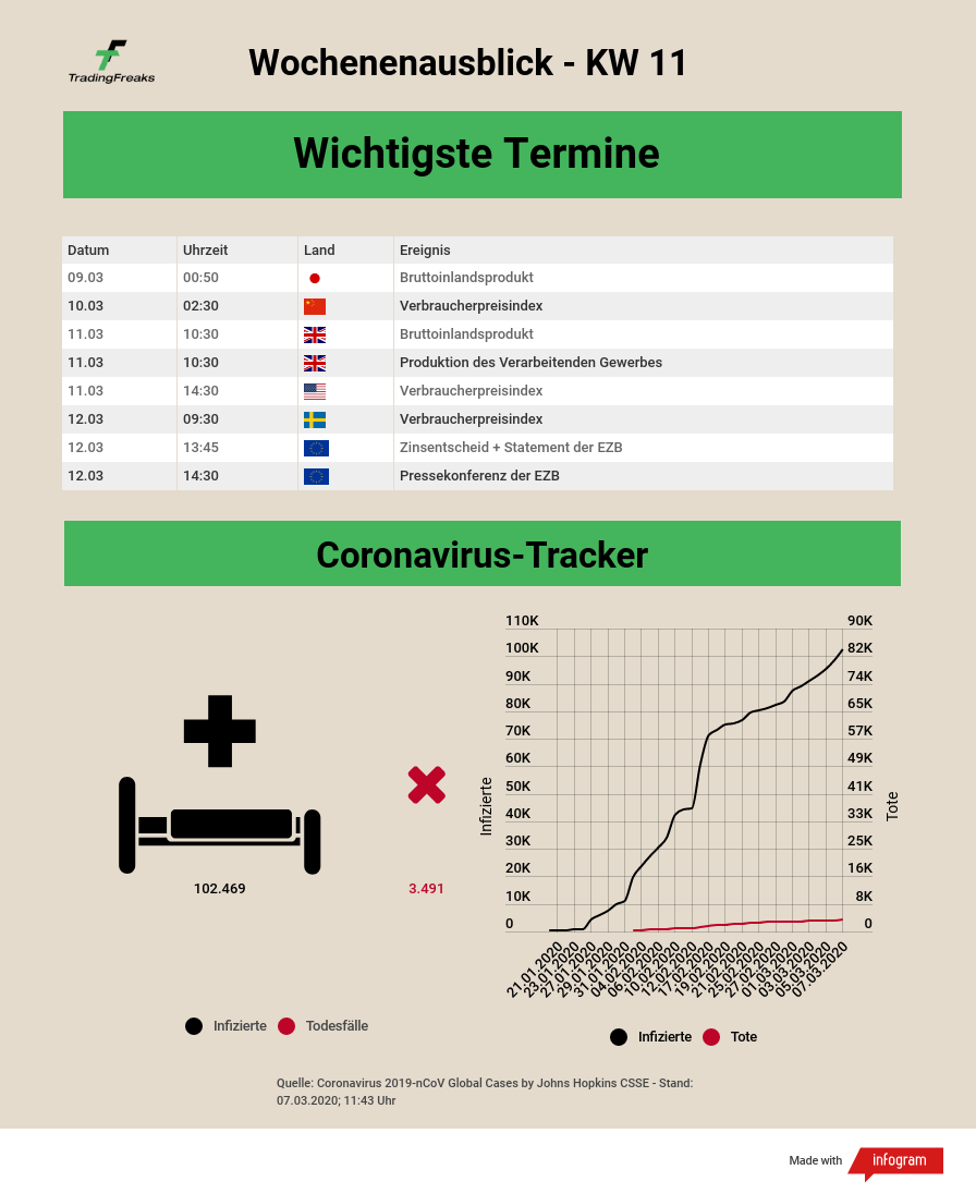 CAD: Neben dem USD war der CAD der größte Verlierer der Woche. Dafür gab es gleich zwei Gründe. Aufgrund der Coronavirus-Sorgen hat auch die BoC den Leitzins am Mittwoch um 50 Basispunkte gesenkt. Außerdem sagte man, dass die Aussichten deutlich schwächer seien als noch im Januar und das man bei Bedarf weitere Anpassungen der Geldpolitik vornehmen werde, um das Wirtschaftswachstum zu unterstützen. Dies hat den CAD schonmal enorm geschwächt. Zusätzlich sorgte ein Ölpreiseinbruch um fast 10% für weiteren Abwärtsdruck im CAD. Der schwache Ölpreis resultierte zum einen aus den Coronavirus-Sorgen und zum anderen, weil die OPEC+ sich nicht auf weitere Fördermengenkürzungen einigen konnte. Auch in Kanada wurden dann am Freitag noch positive Arbeitsmarktdaten veröffentlicht, welche keine Beachtung fanden. Unsere Einschätzung zum CAD: bärisch