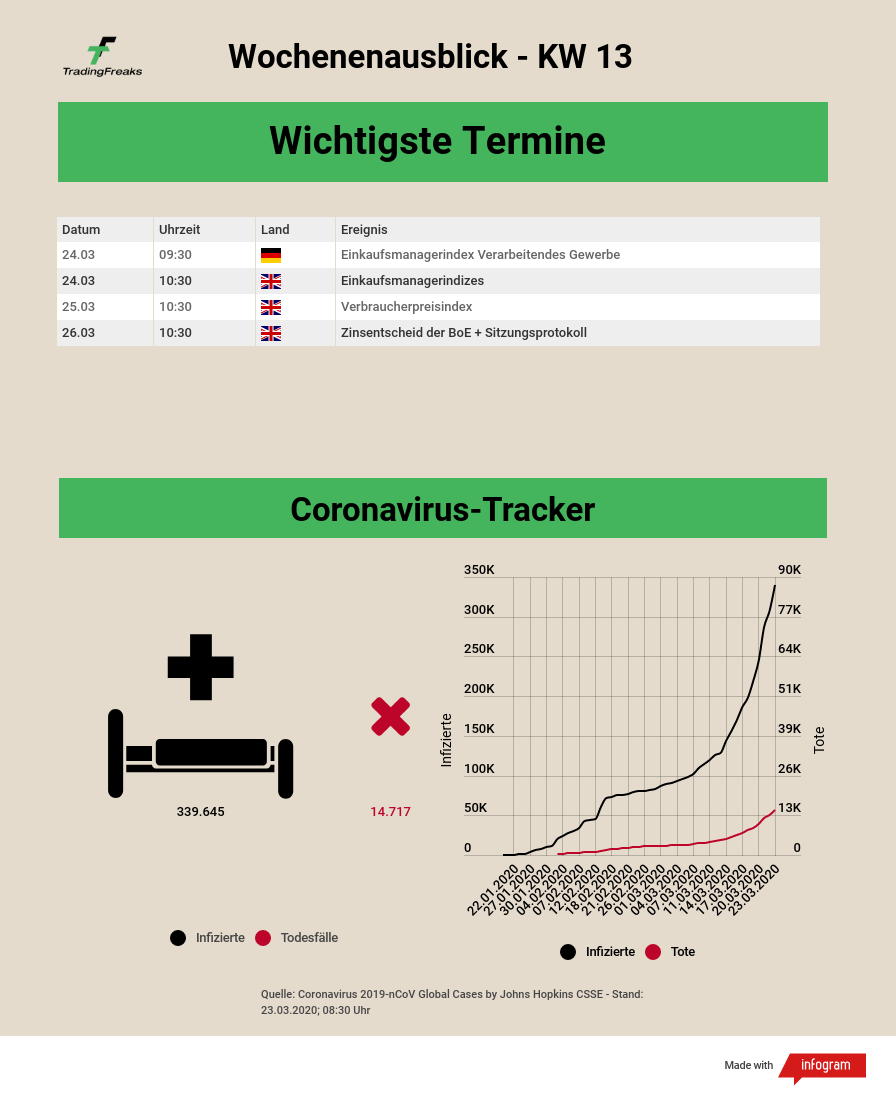 GBP: Auch in Großbritannien wird die Lage immer ernster. Hier werden Unternehmen garantierte Darlehen in Höhe von 330 Milliarden GBP zur Verfügung gestellt. Außerdem bekommen Darlehnsnehmer bei Zahlungsschwierigkeiten eine 3-monatige Ratenpause. Der Vorsitzende der BoE Bailey sagte zusätzlich, dass man tun werde was nötig ist, um die Wirtschaft zu unterstützen. Ein erster Schritt war hier die Senkung der Zinsen von 0,25% auf 0,1% und eine Erhöhung der Anleihenbestände. Unsere Einschätzung zum GBP: leicht bärisch
