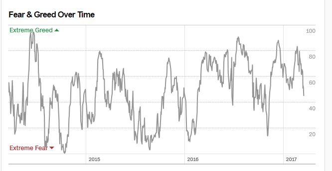 Übrigens: Am Morgen des 24.3. steht der Zeiger im roten Bereich (30% = Fear), was vermutlich vermutlich darauf zurückzuführen ist, dass Trump in der Nacht zuvor die Abstimmung zu Obamacare zurückgezogen hat und die US-Anleger nun einen rapiden Kursverfall befürchten.