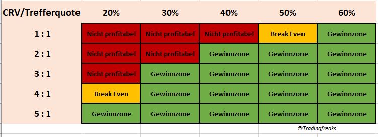 In der nachfolgenden Tabelle bekommst du eine gute Übersicht, welche Trefferquote beim jeweils vorgegebenen CRV nötig ist, um in die Gewinnzone zu kommen.