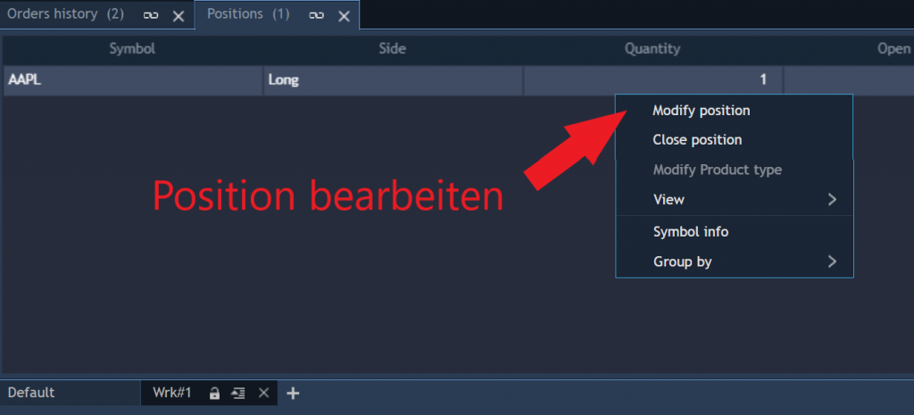 Sobald du einen Trade eröffnet hast, wird er im unteren Orderfenster “Positions” angezeigt.