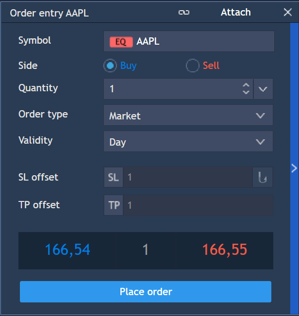 Danach kannst du die Positionsgröße (“Quantity”) und die Orderart bestimmen.